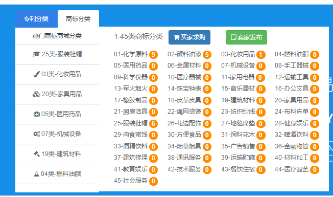 3.您也可以直接進入專利商城或者商標商城,直接在商城里通過關鍵字搜索,或者通過類別查找,亦或者直接瀏覽平臺推薦,找到合適自己的專利商標;