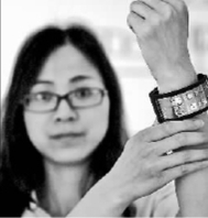 5月17日,具有完全自主知識產權的維信諾(固安)第六代全柔AMOLED(有源矩陣有機發(fā)光二極體面板)生產線,在河北固安啟動運行。圖為工作人員在展示一款柔性顯示智能可穿戴手機。新華社發(fā)